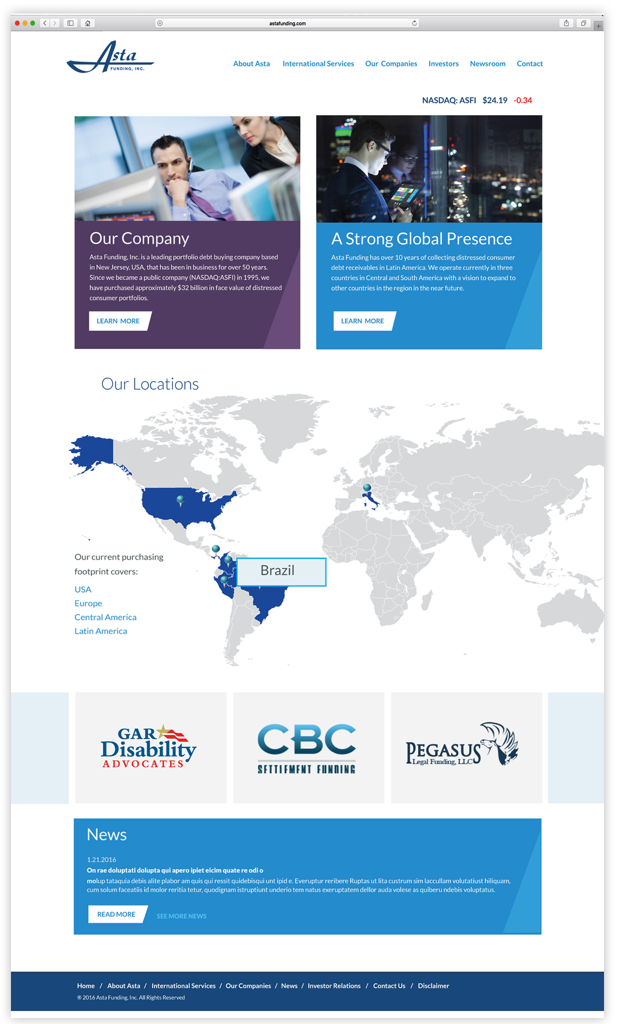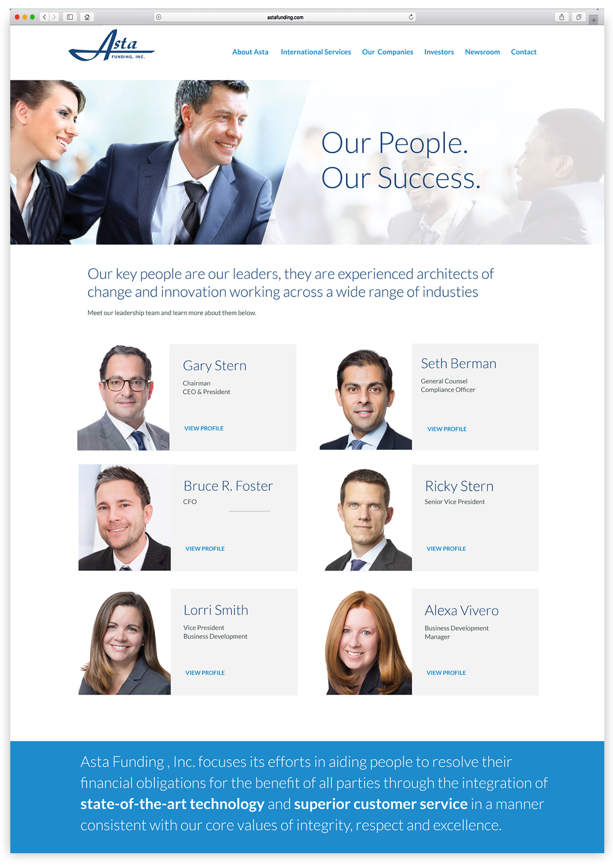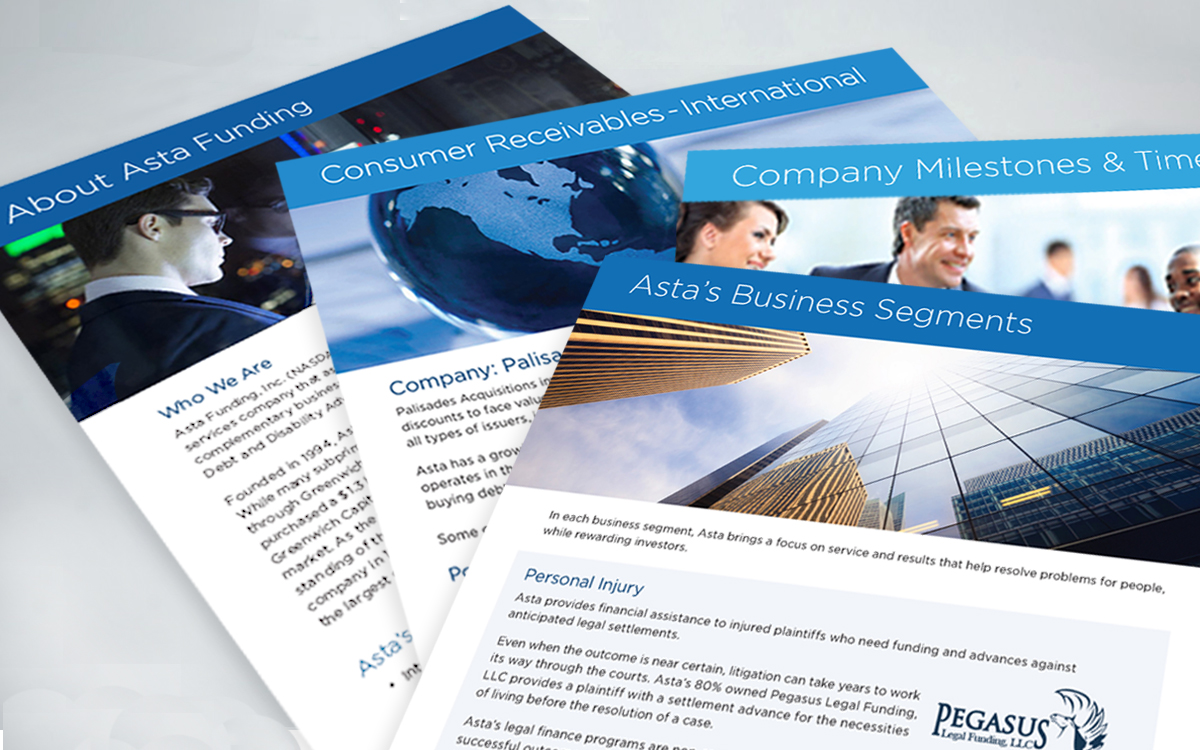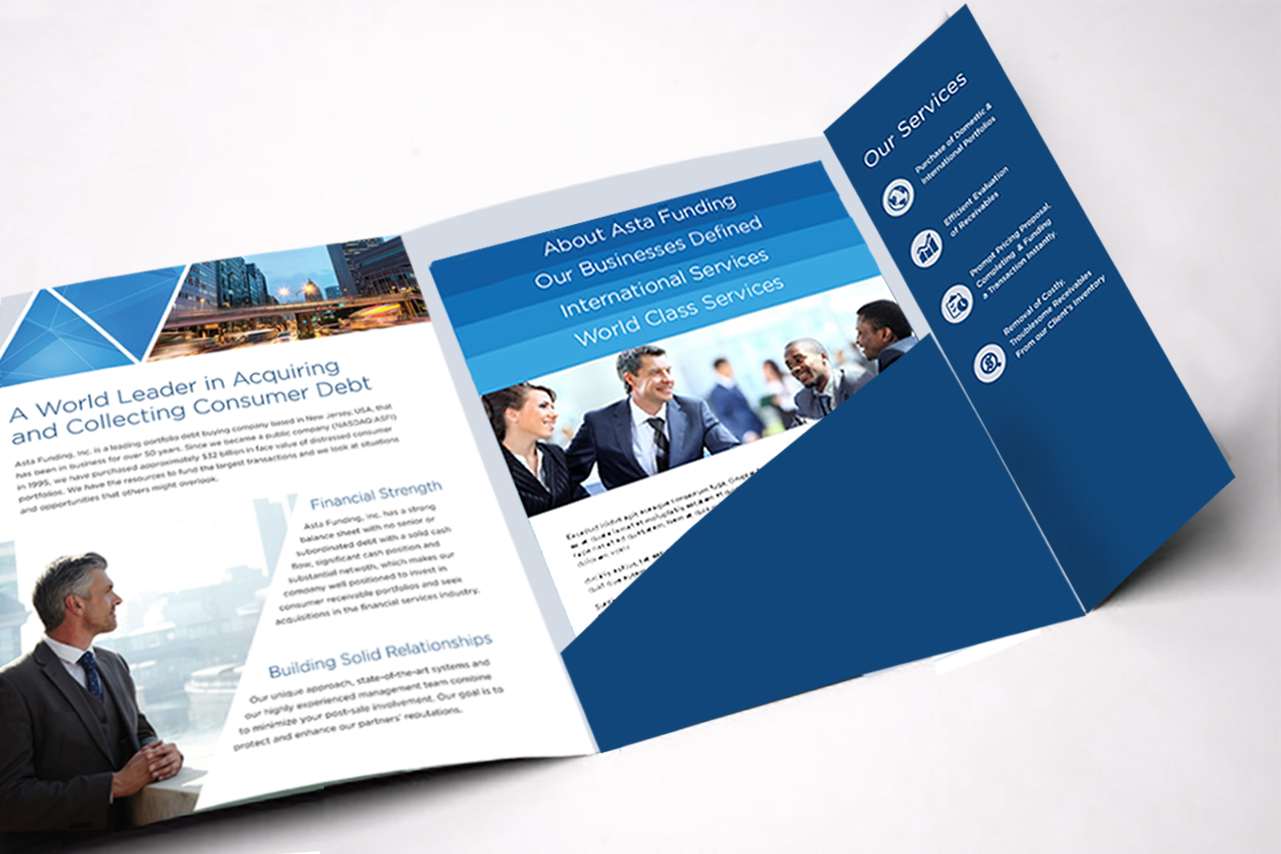 For over 50 years, Asta Funding has been a world leader in portfolio debt buying and has purchased over $32 billion in distressed consumer portfolios with the resources to fund the largest transactions. They turned to us to assist them in increasing awareness of their competitive advantages and elevating their presence not only in the U.S. but around the globe. We began with the design and development of advertising collateral. Then continued into a range of traditional and digital communications, including the launch of their first website. The brand image we developed conveys Asta Funding’s traits of expertise, financial strength, communication, innovation and results.