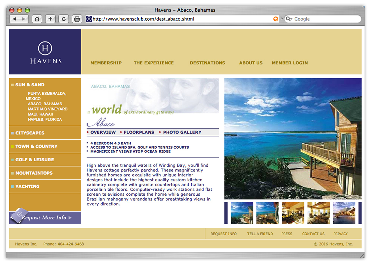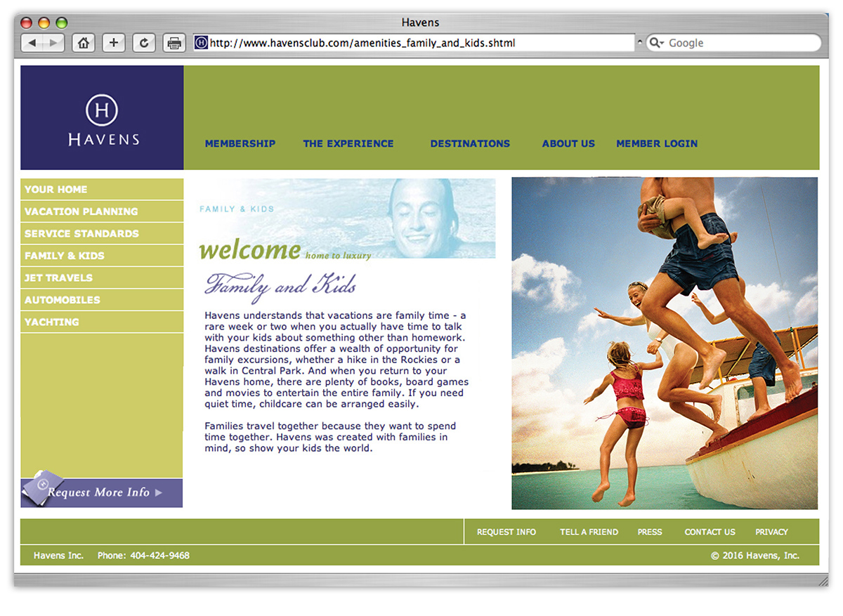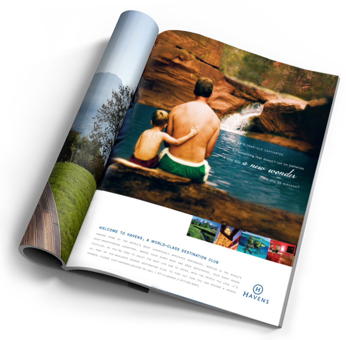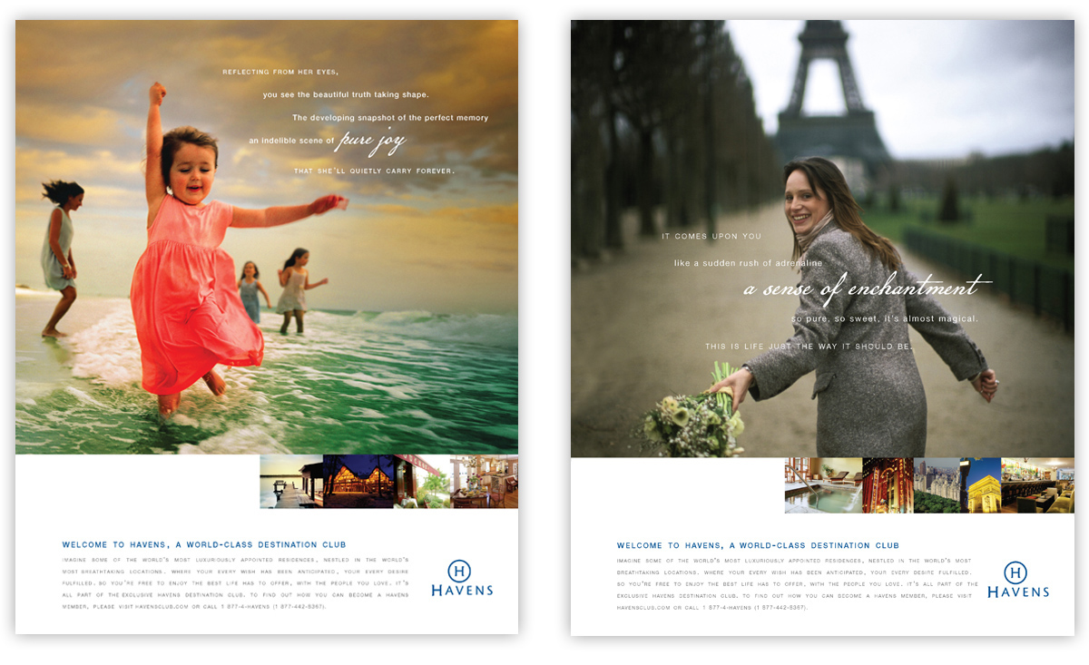 The destination club lifestyle offers high net worth individuals the opportunity to vacation in spectacular residences around the world. Havens, a startup in this ultra high-end category, wanted to instantly compete with established players. To position their brand as a vacation haven, we used stylized, dream-like photography to create a mood, and hypnotic, poetic copy to build a warm, inviting feeling. Our message: It isn’t about the destinations, but the journey. It isn’t how far you go, but how close you become. It isn’t about discovering the world, but discovering each other.