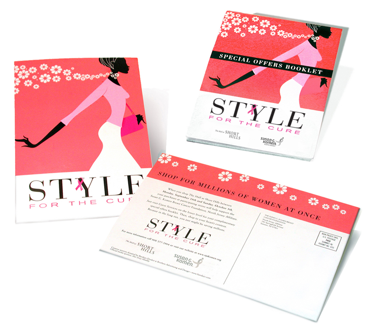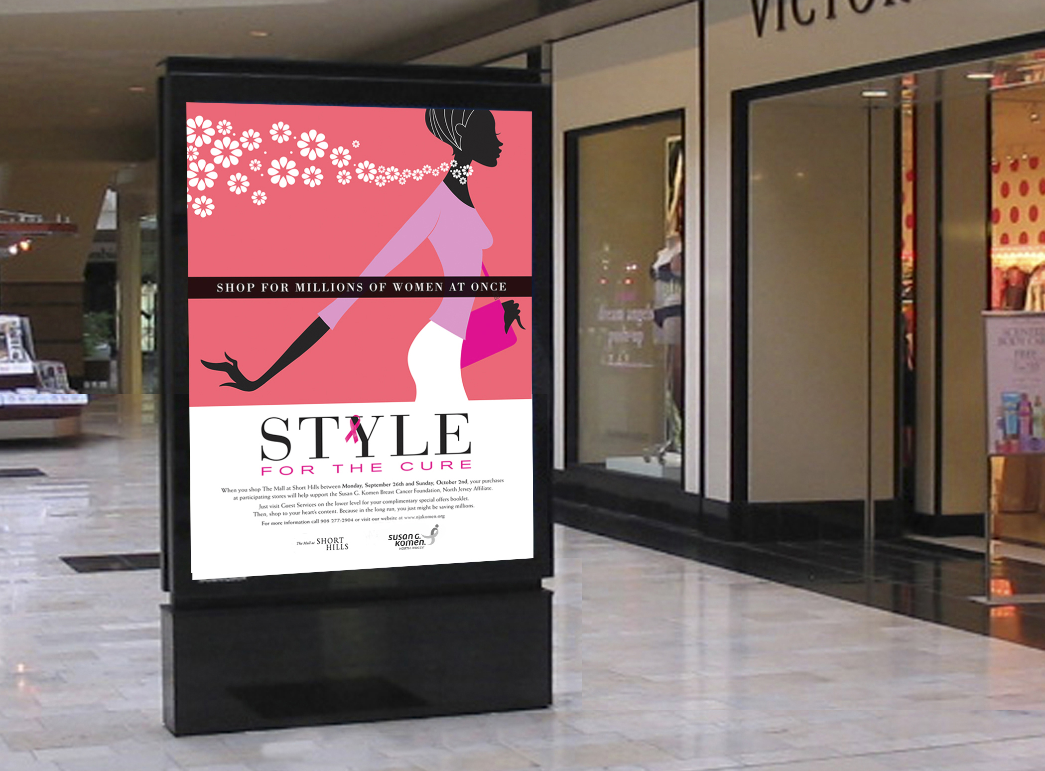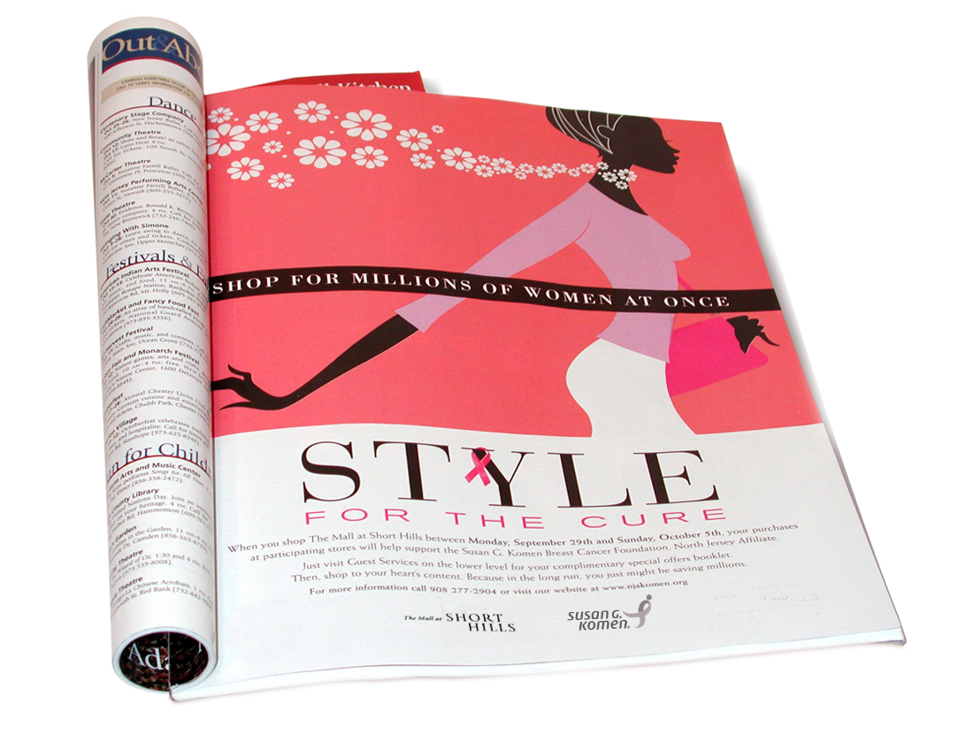 “Style for the Cure” is fundraiser created by the Susan G. Komen Breast Cancer Foundation and The Mall at Short Hills – NJ’s most exclusive mall. Our challenge was to create an identity and advertising for the event that had real stopping power and met the upscale expectations of merchants. Our solution was a sophisticated campaign, which exuded an elegance befitting the mall’s brands and clientele. Our theme, “Shop for Millions of Women at Once,” highlighted the benevolence of participating in this event and even empowered our audience to spend. The event exceeded all fundraising expectations.