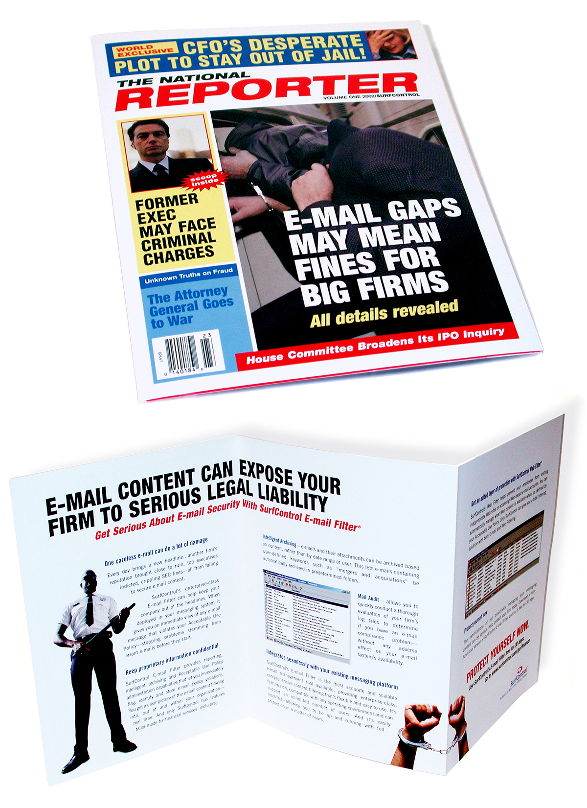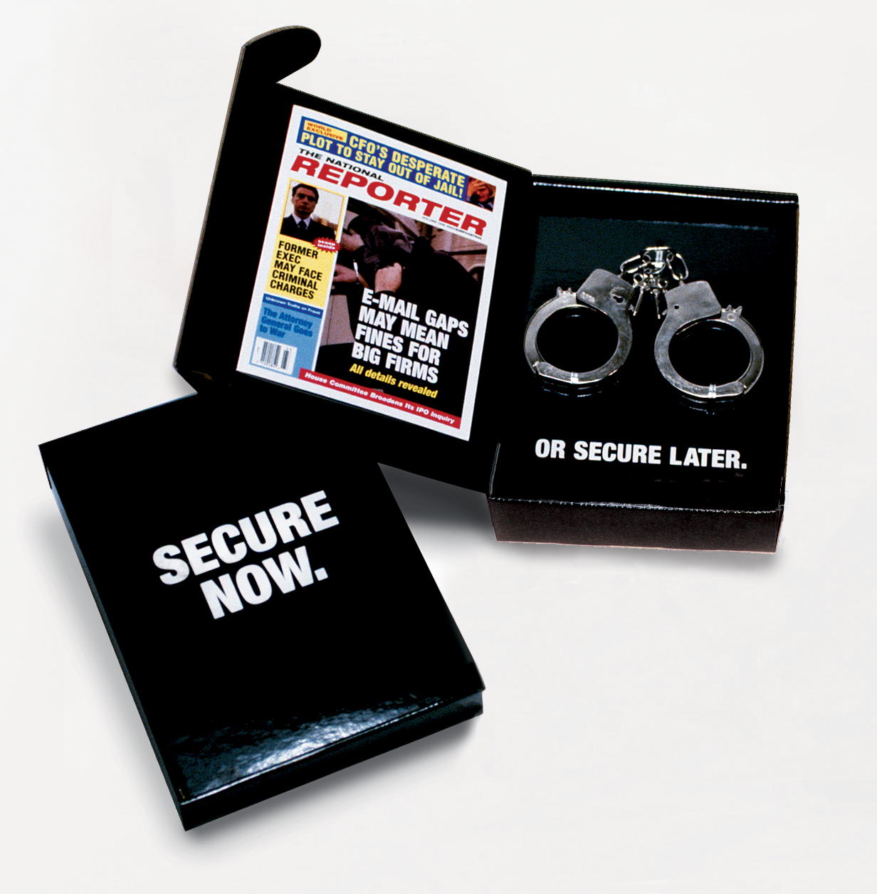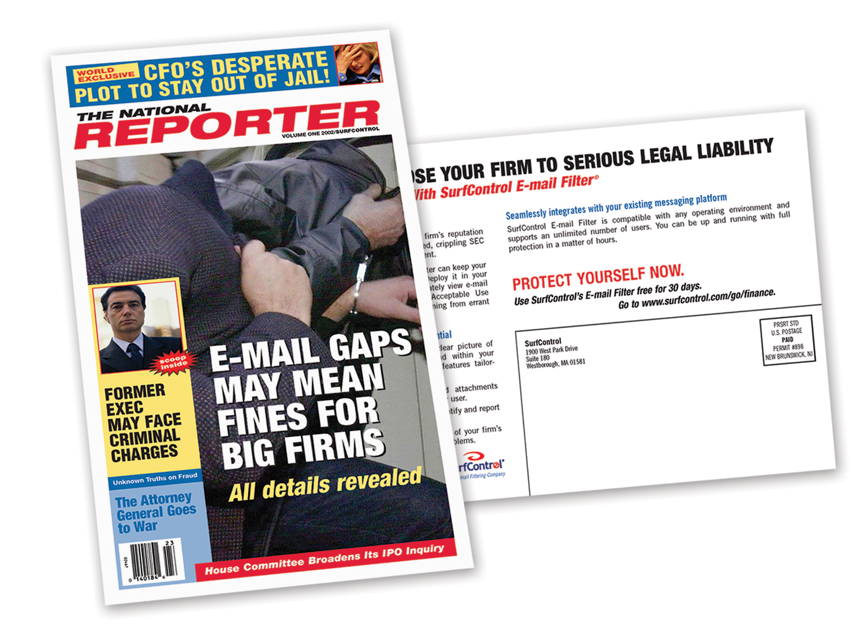 A few years ago, Wall Street firms were rocked by scandal when internal emails from their analysts went public denouncing the very stocks they were praising in the press. The most famous was the “This stock is a dog” quote from Henry Blodget. SurfControl’s email filtering product would have prevented this from happening and they knew it was an ideal opportunity to increase sales if they could break through the clutter and reach the CIO’s of these firms. Our solution was a dimensional box, with a very clear message....either you secure your network now or your CEO could be secured in handcuffs some day soon. The response was overwhelming.